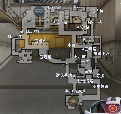卫星基地-竞技荣耀地图同样将部分点位替换为了以A、B区为前缀的命名,更符合大部分CFer游戏时的报点习惯,同时新增部分标志性建筑物点位名称,详情如下: