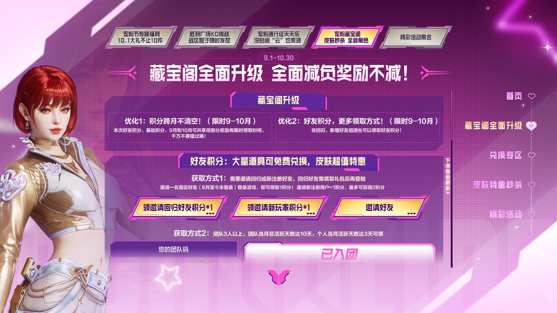 参与方法:完成对应任务成功获取基础积分或好友积分后,即可兑换全新可拓三槽角色丛林之刺、星光等道具,并且9月及10月的好友积分与基础积分将可以共享使用不再跨月清零!