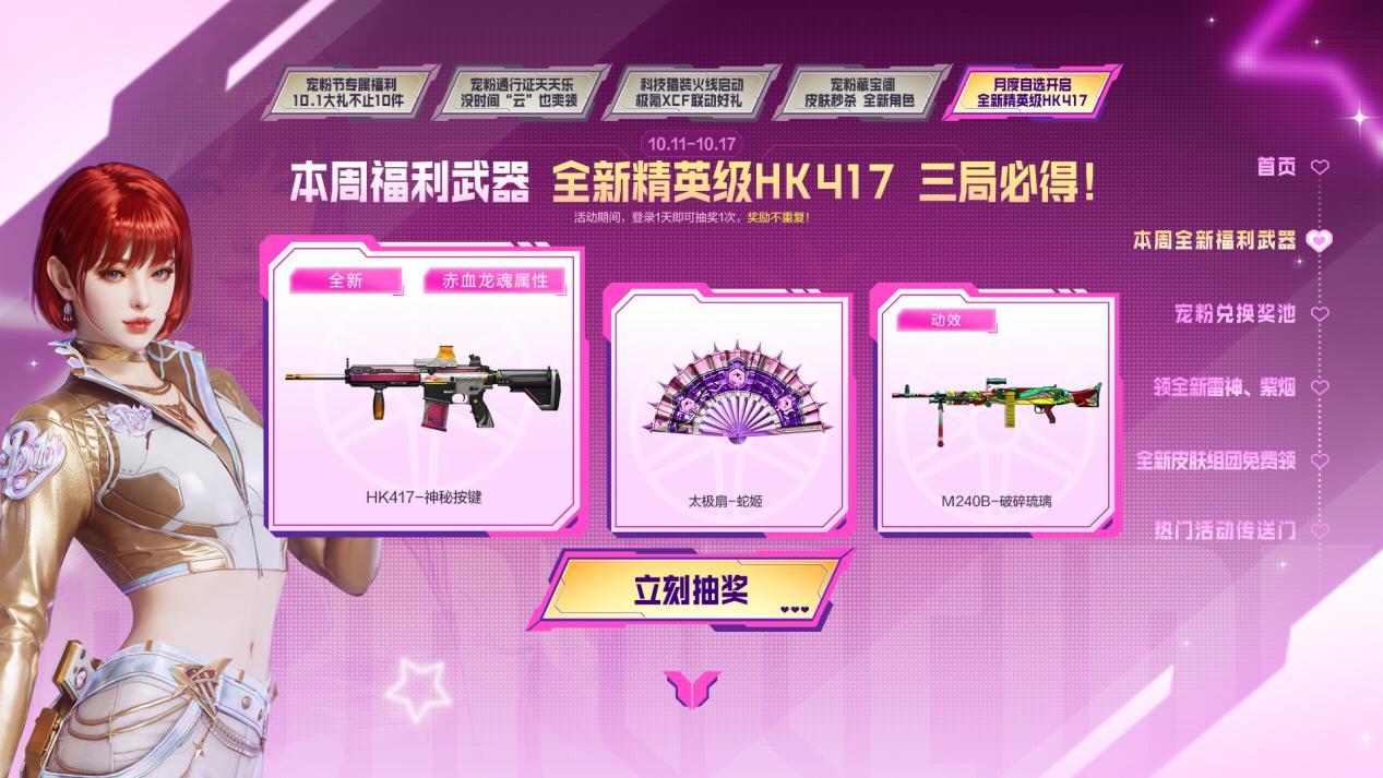 参与方法:CFer每日登录游戏后即可领取1积分,每周登录也可领取1积分,10月1日当天登录可直接领取2积分,消耗积分即可兑换奖池内武器道具。