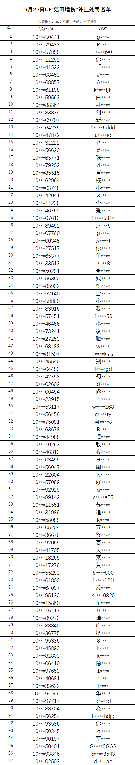 截至9月22日,我们已针对在游戏中出现的14款具备上述功能的外挂(致命一击、KK范围、FBOX范围、海狗、CC等)进行严打,当前已经对13990个使用上述外挂的游戏账号进行了为期十年的封禁。